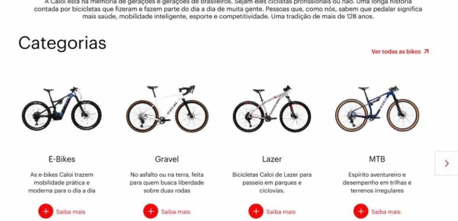 Com mais de um século de atuação, a Caloi se consolida como a maior marca de bicicletas do país. O novo site funciona como uma vitrine desse legado aliado ao futuro, com lançamentos inovadores em diversos segmentos do mercado, sempre pautados por tecnologia e inovação.